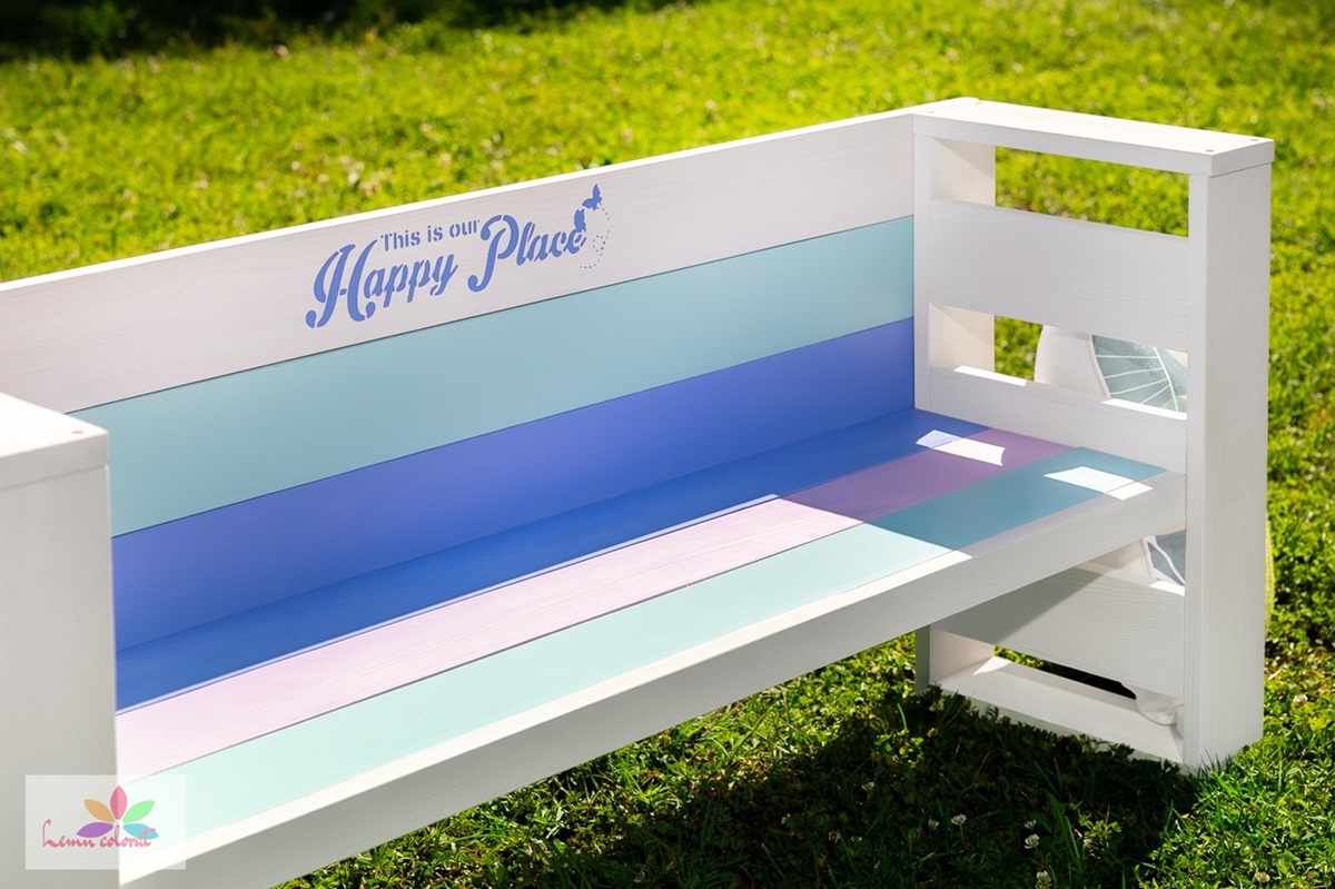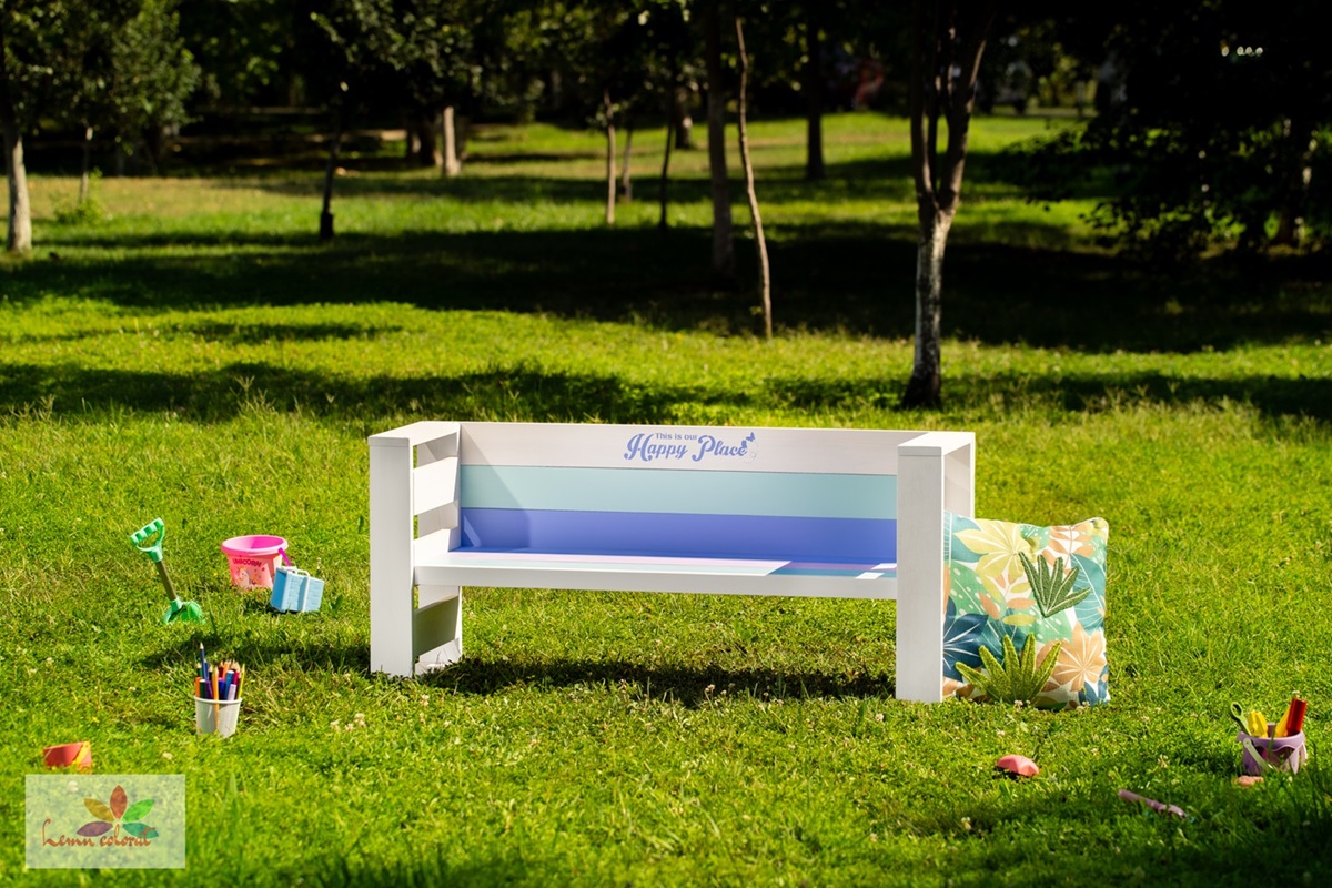 Bancuta este realizata din lemn solid de pin, colorat cu vopsea pe baza de apa, ecologica