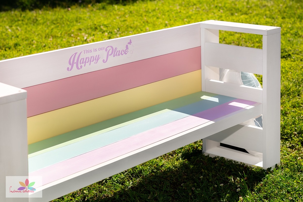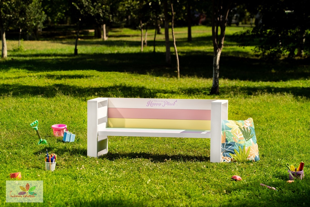 Bancuta este realizata din lemn solid de pin, colorat cu vopsea pe baza de apa, ecologica