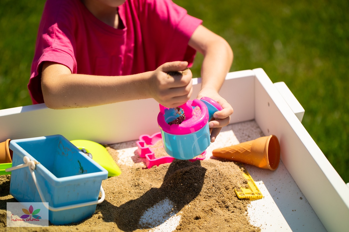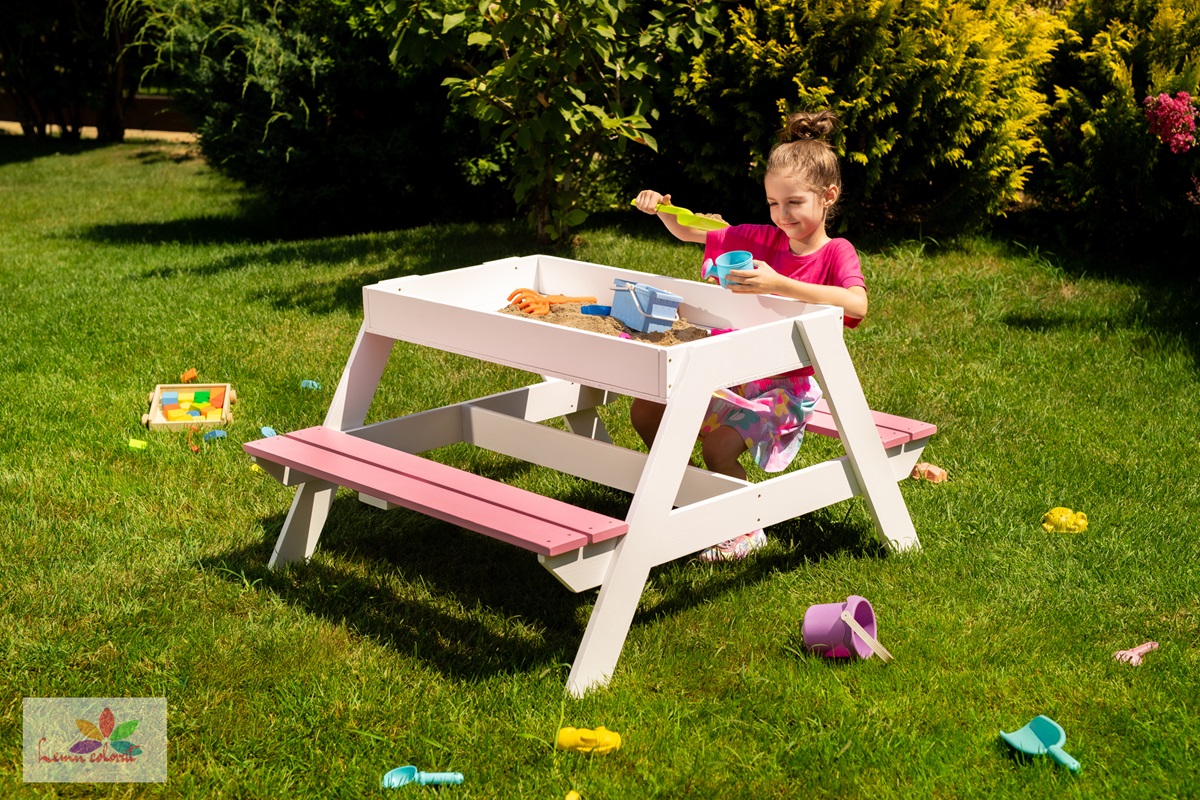 Este prevazuta cu bancute stabile si lada pentru nisip, perfecta pentru a dezvolta creativitatea copiilor in spatiul exterior