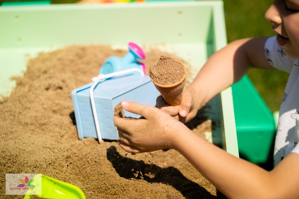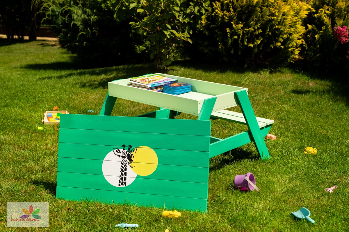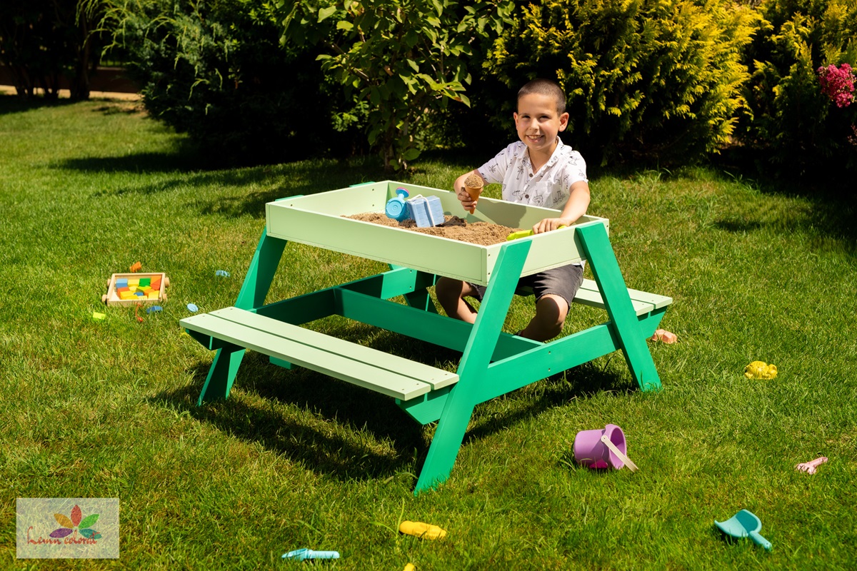 Este prevazuta cu bancute stabile si lada pentru nisip, perfecta pentru a dezvolta creativitatea copiilor in spatiul exterior