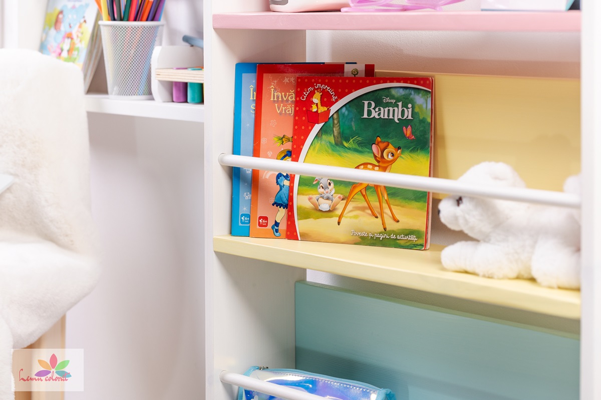 Am venit in ajutorul copiilor si am colorat acest produs pentru a ii atrage sa isi organizeze cat mai usor jucariile si cartile de povesti