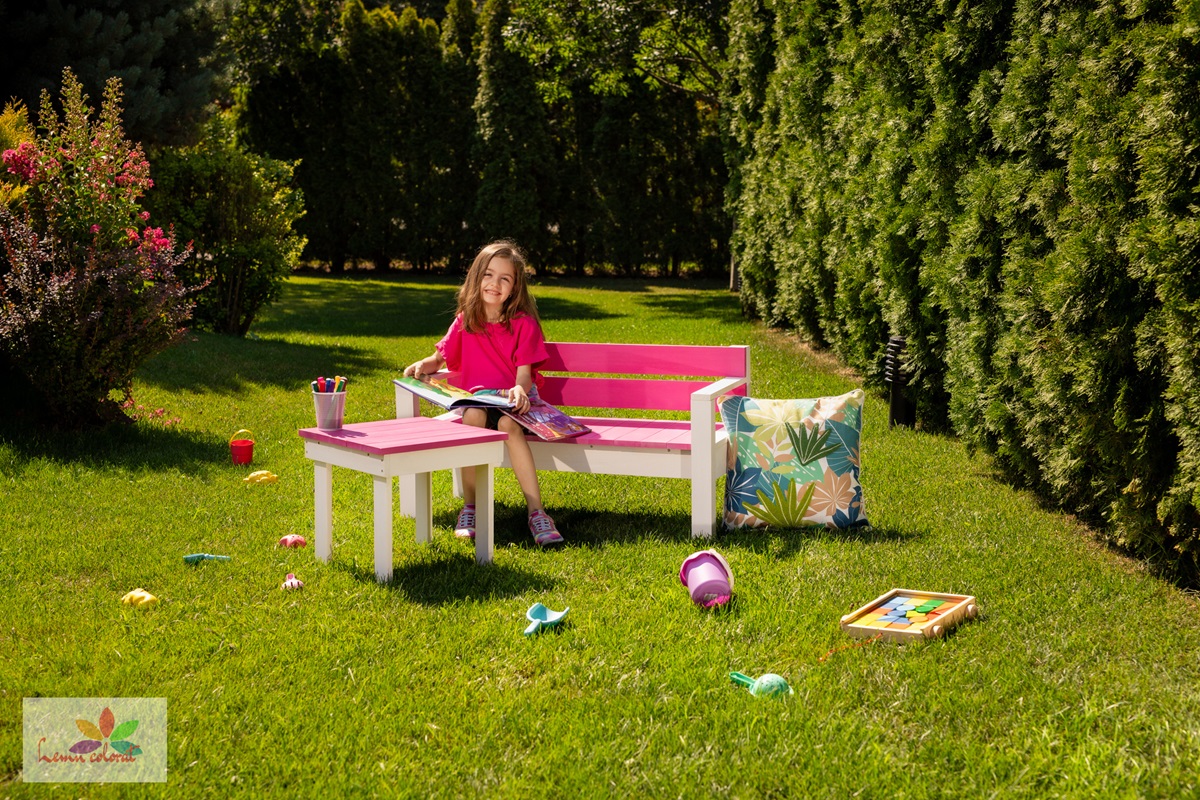 Bancuta este realizata din lemn solid de pin, colorat cu vopsea pe baza de apa, ecologica