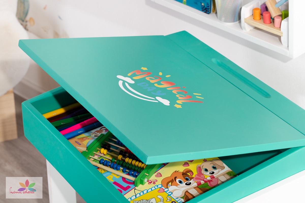 Biroul are un spatiu de depozitare generos si le ofera micutilor posibilitatea de a pastra rechizite scolare, carti de colorat, carioci, acuarele, etc.