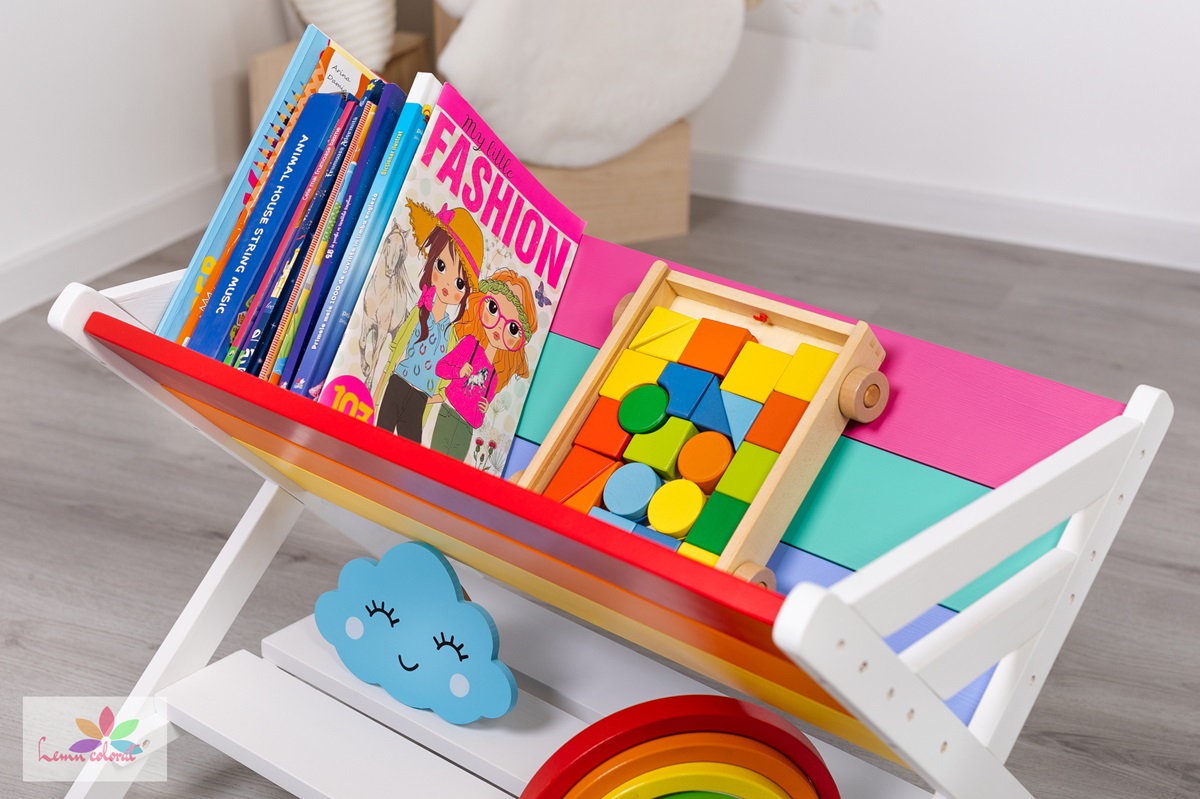 Spatiul generos de depozitare poate fi ocupat cu carti de diverse dimensiuni, carioci si creioane colorate, plusuri, jucarii, etc.